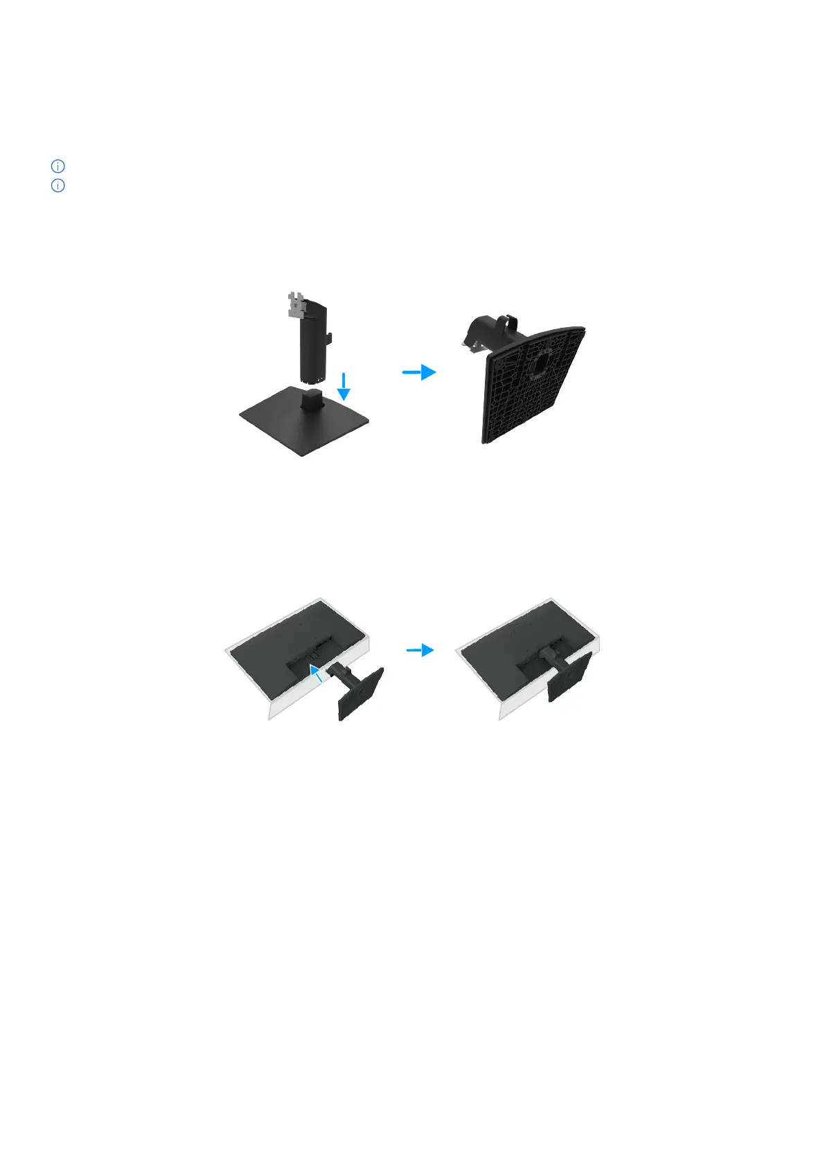 b. Schuif de monitorstandaard in de juiste richting naar beneden op de voet van de standaard totdat deze vastklikt.