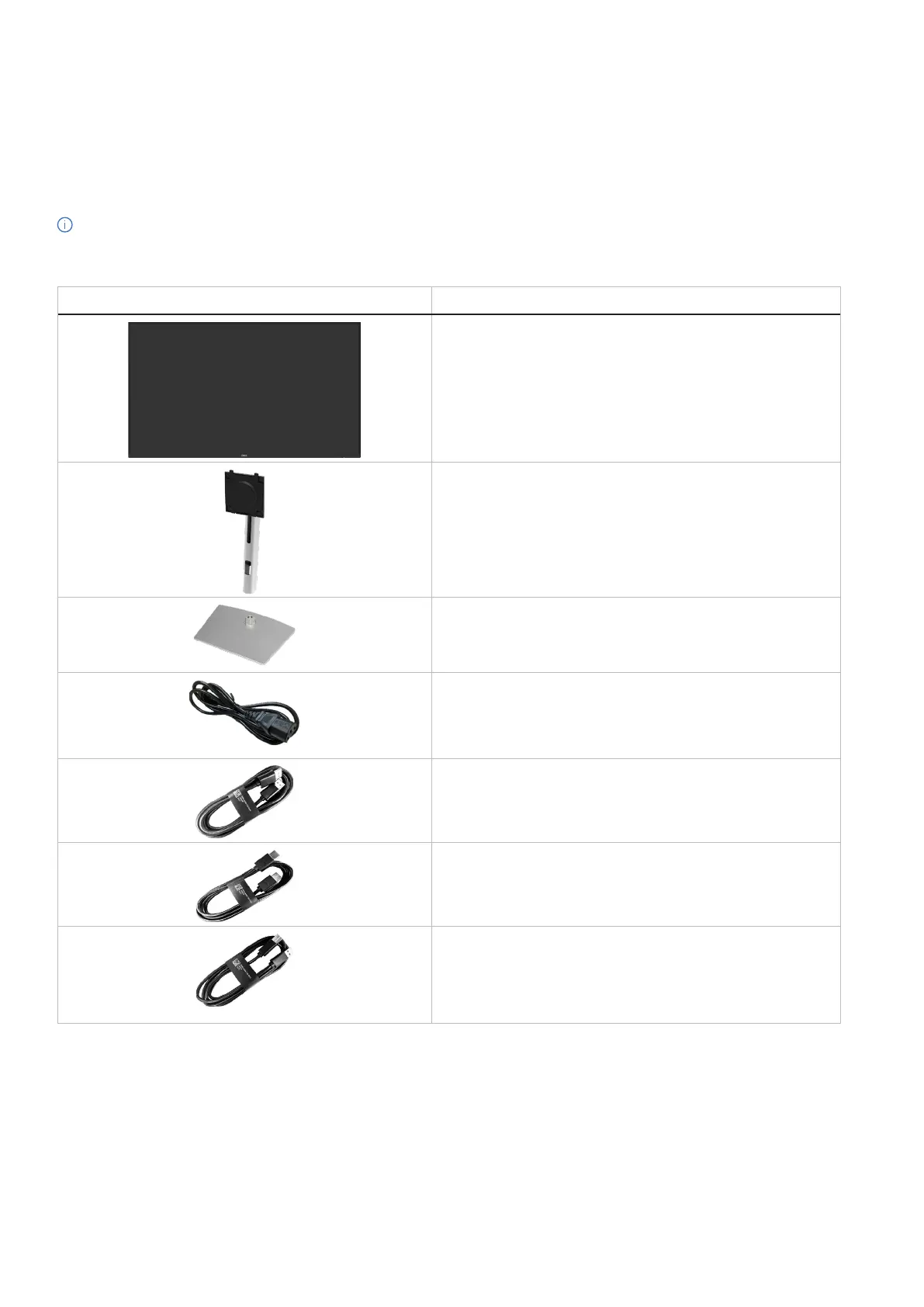 The following table provides the list of components that are shipped with your monitor. If any component is missing, contact Dell. For