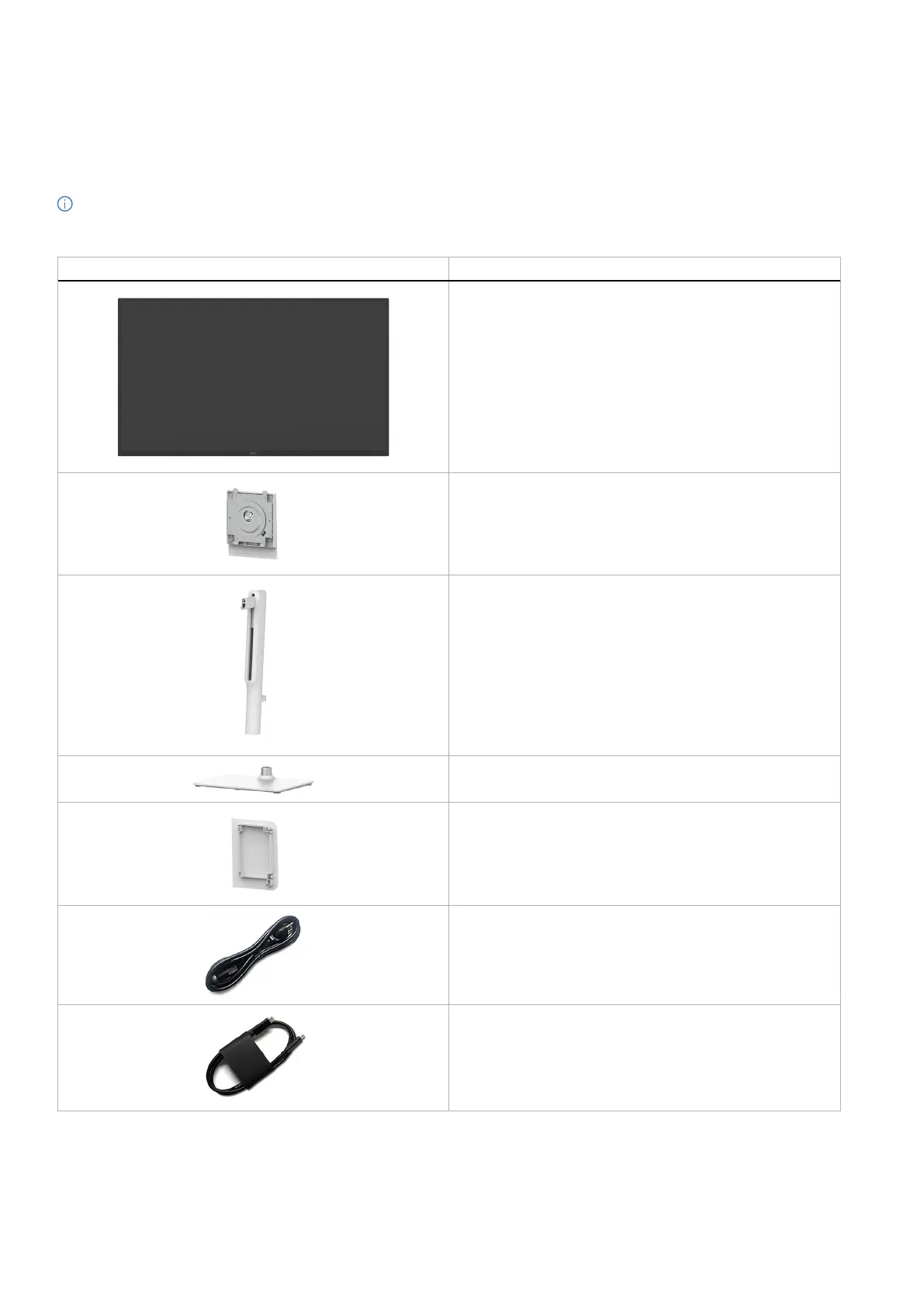 The following table provides the list of components that are shipped with your monitor. If any component is missing, contact Dell. For