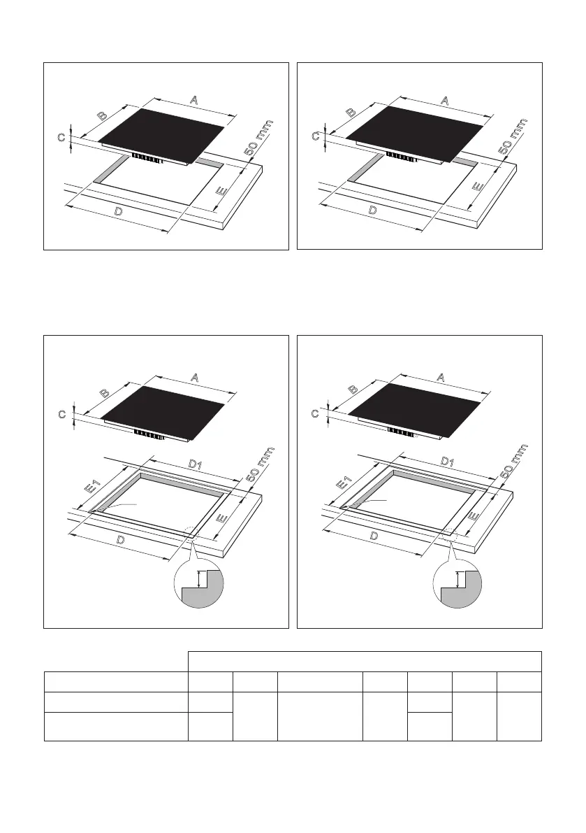(**) van de bovenkant van het aanrecht tot de onderkant van de kookplaat.