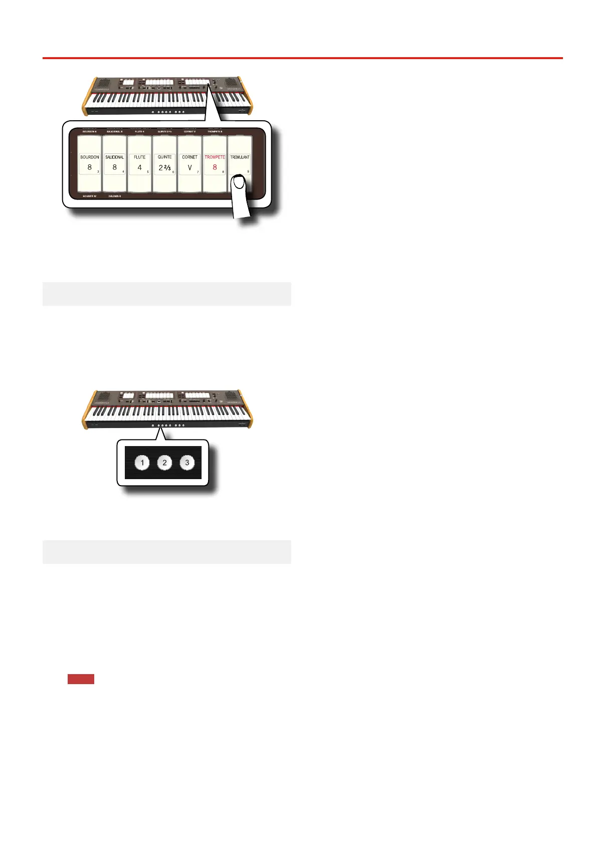 1. Press and hold the lower part of the [TREMULANT] tilt tab