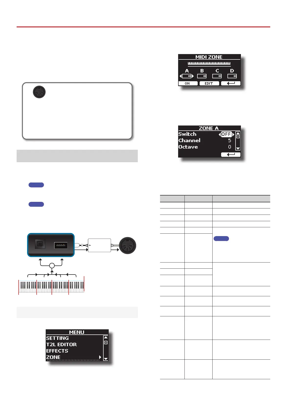 each zone, you can set the MIDI channel, dene the keyboard range, adjust