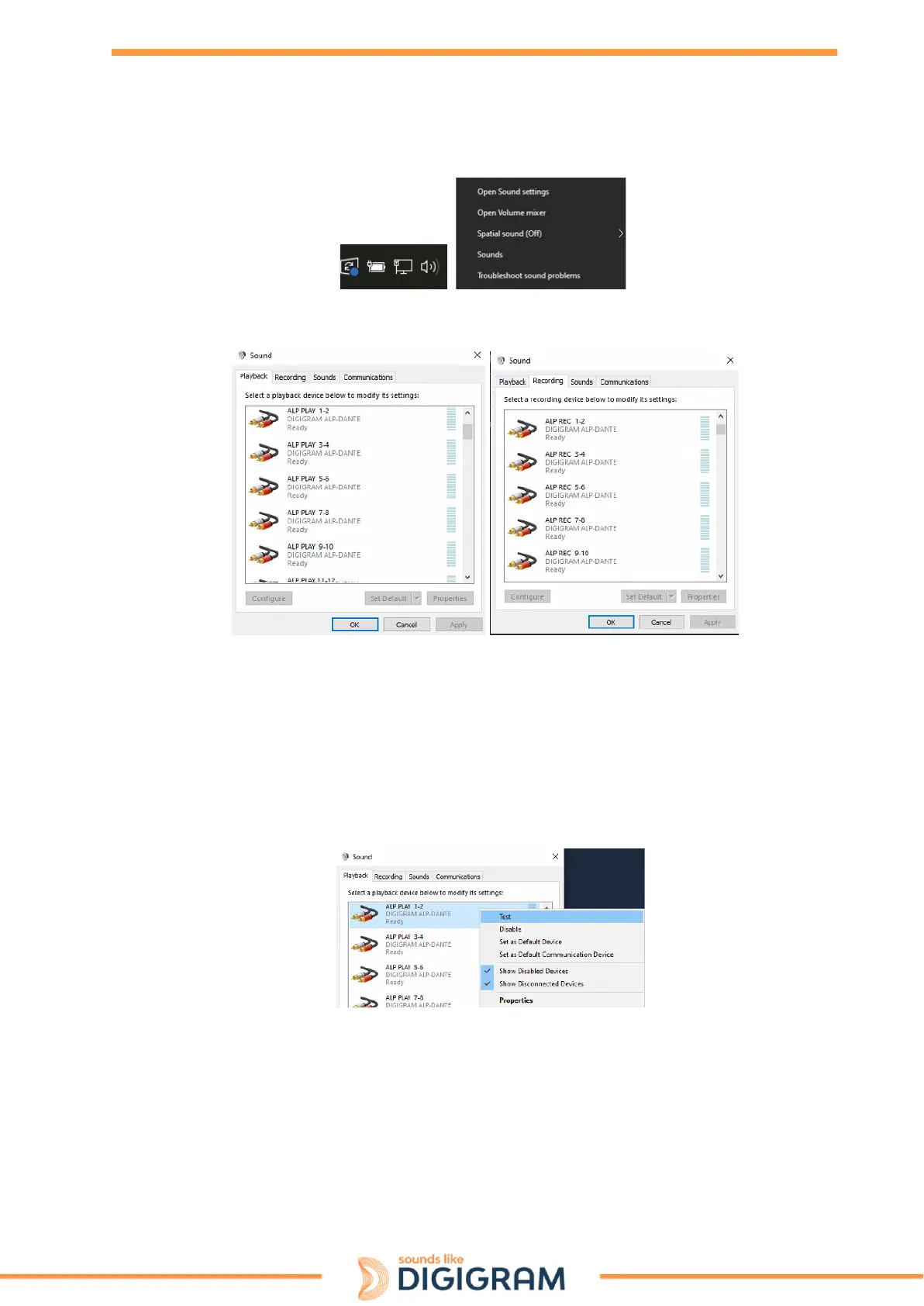 Playback to an output device of the ALP-DANTE can be tested by right clicking on it and selecting