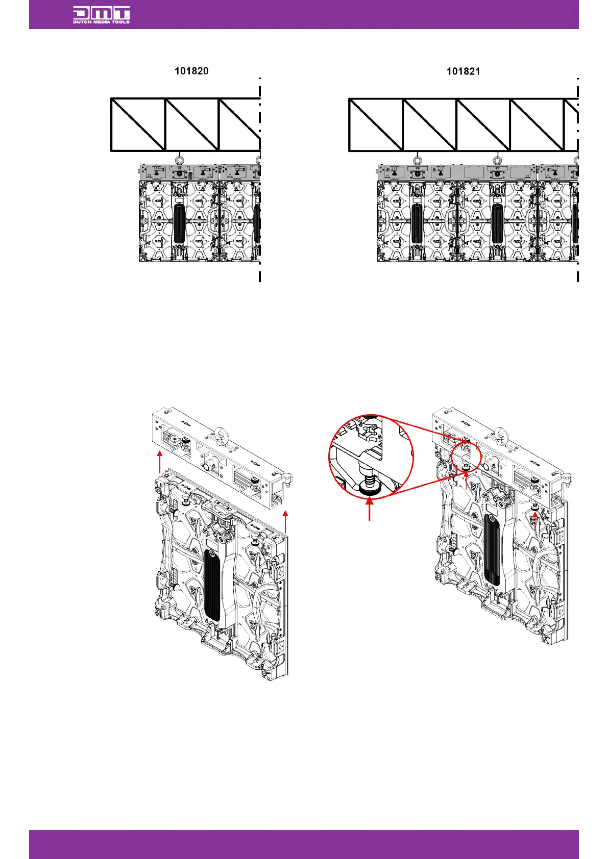 01) Put the LED screen below the rigging bar and let the magnetic strip on top of the LED screen snap to the01)
