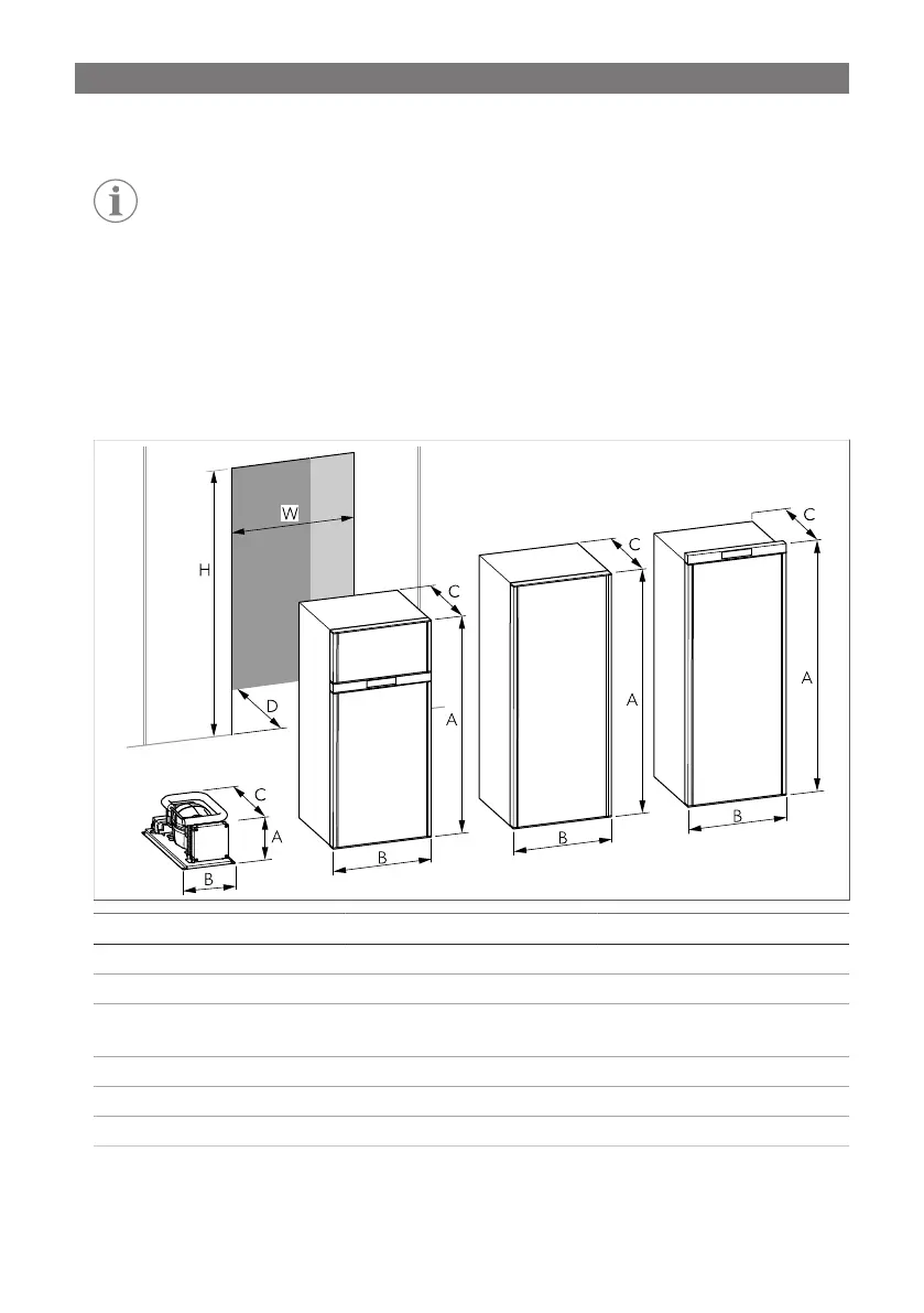 • Overvej køleskabets dimensioner (se kapitel Tekniske data på side 27) og de påkrævede dimensioner for