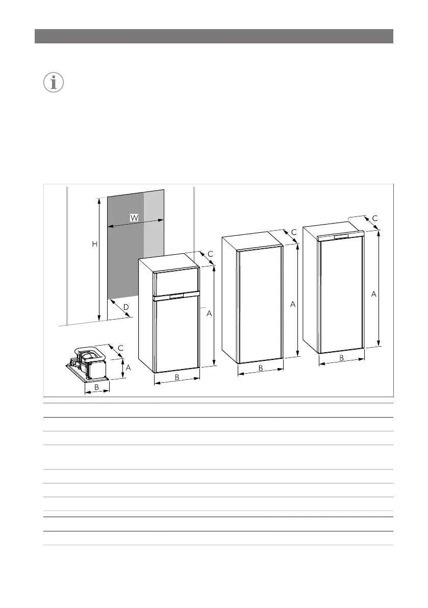 • Ta hänsyn till kylskåpets mått (se kapitlet Tekniska data sida44) och de mått som krävs för urtaget: