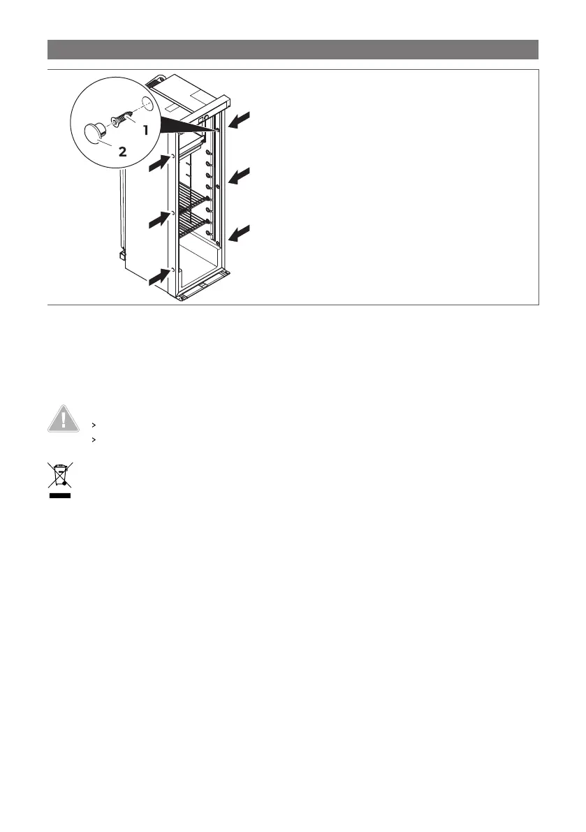 2. Wkręcić śruby (1) wplastikowe tulejki wścianach bocznych lodówki oraz dalej wściany wnęki.