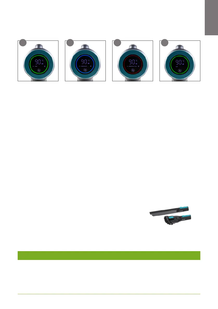 lichtring en indicatiebalk geven aan welke zuigkracht van toepassing is. De knoppen +/-