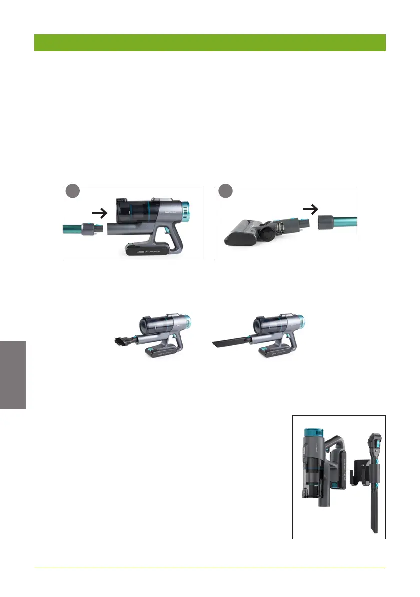 I vari accessori possono essere agganciati all’asta (scopa elettrica) o direttamente al gruppo motore,