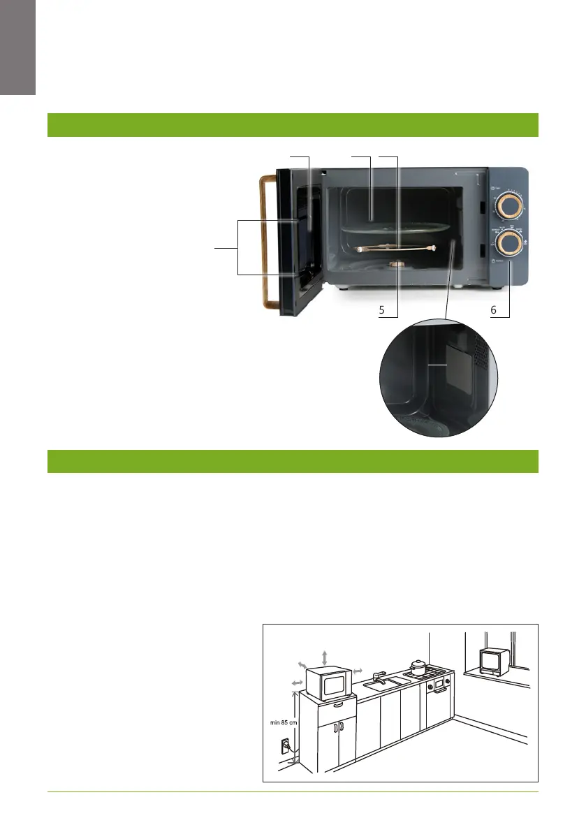 • Kies een plaats om de microgolfoven te installeren, waar voldoende open ruimte is om