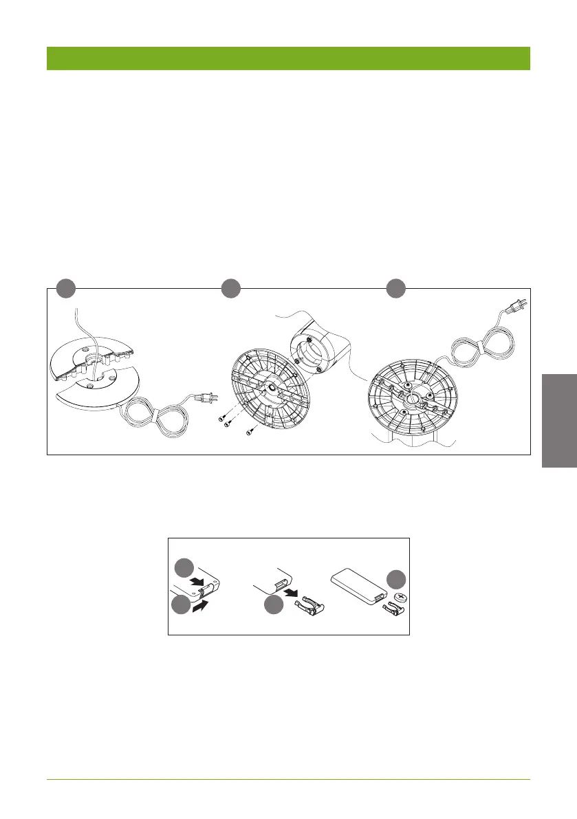 4. Fije la base al ventilador con los tornillos incluidos. Guíe el cable hacia un lado y sujételo en los