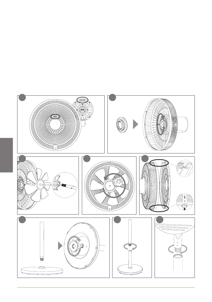 4. Fije las aspas del ventilador con la tapa. Enrósquela en sentido contrario a las agujas del reloj.
