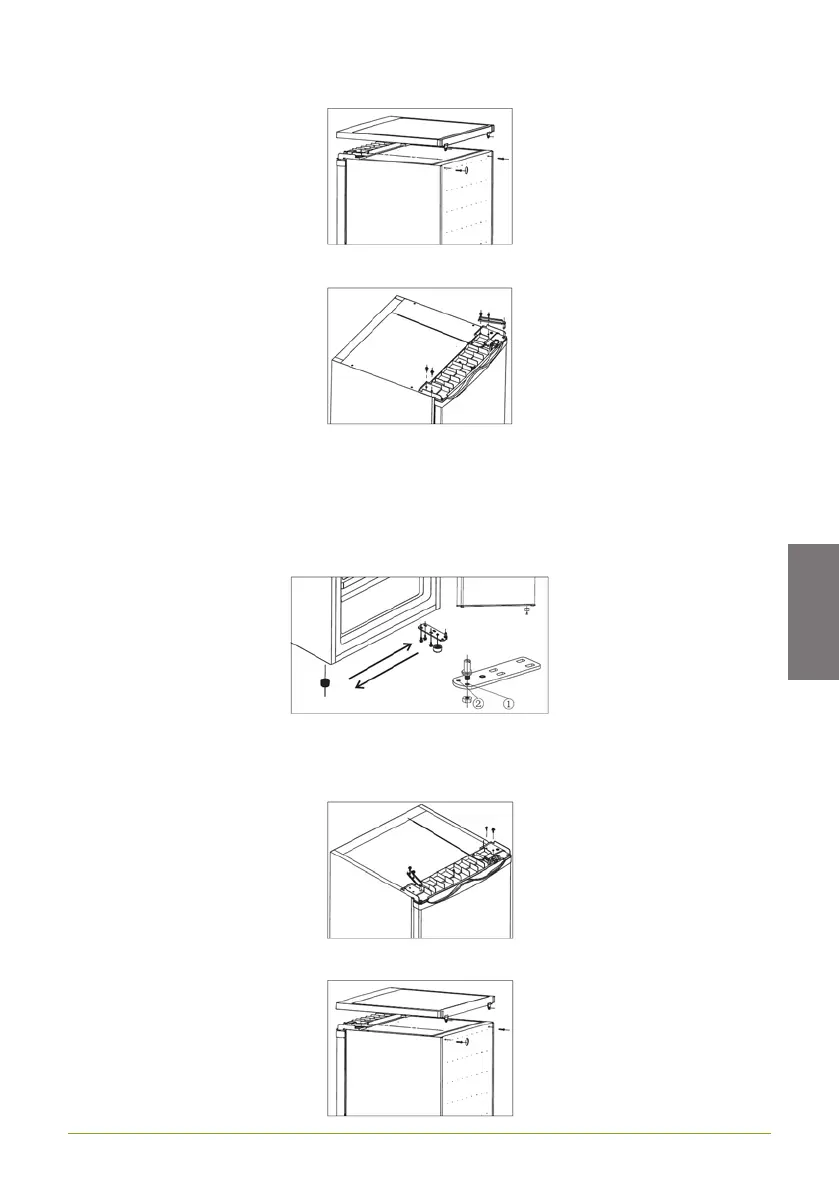 7. Coloque la puerta en la bisagra inferior y vuelva a jar la cubierta y la bisagra superior en el