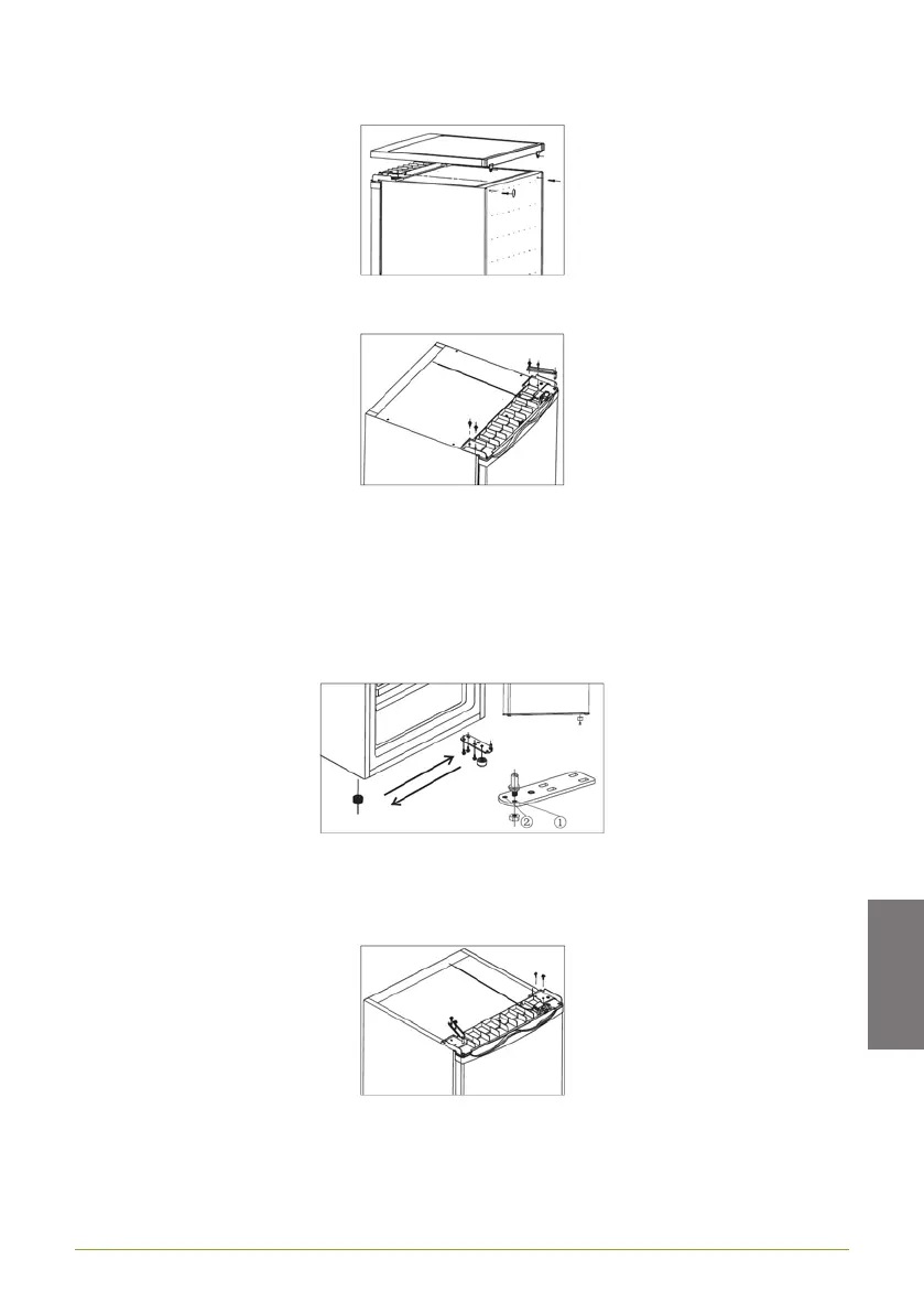 2. Odšroubujte čtyři šrouby z horní části a sejměte horní závěs dveří a přiložený kryt.