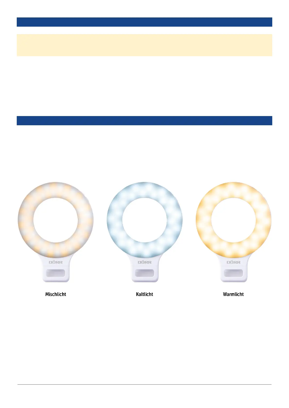 Zum Einschalten des LED Selfie Ringlichts, drücken Sie kurz die Ein/Aus Taste (04). Das LED Selfie Ringlicht befindet sich im Lichtmodus
