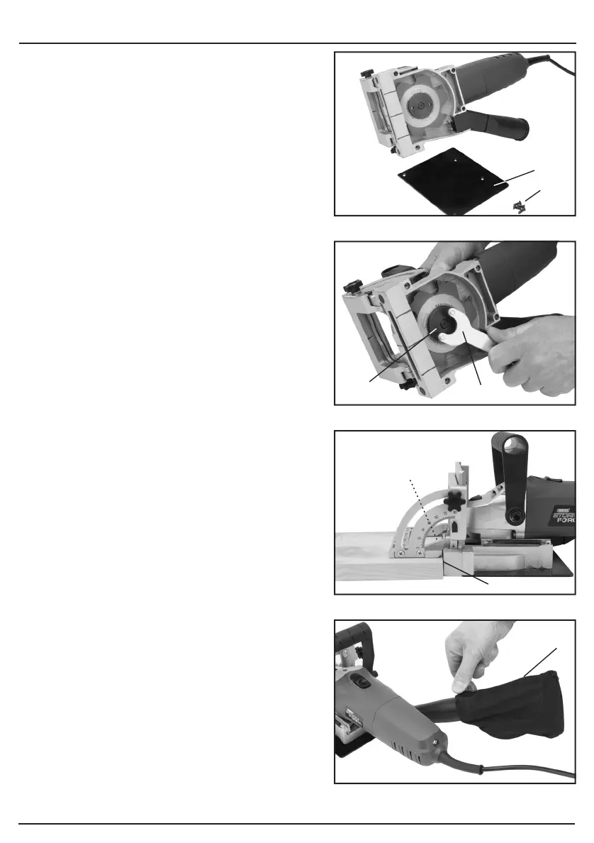 The biscuit jointer is equipped with a dust bag for