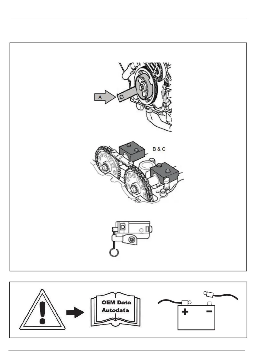 Lock the camshaft in position using components B and C.