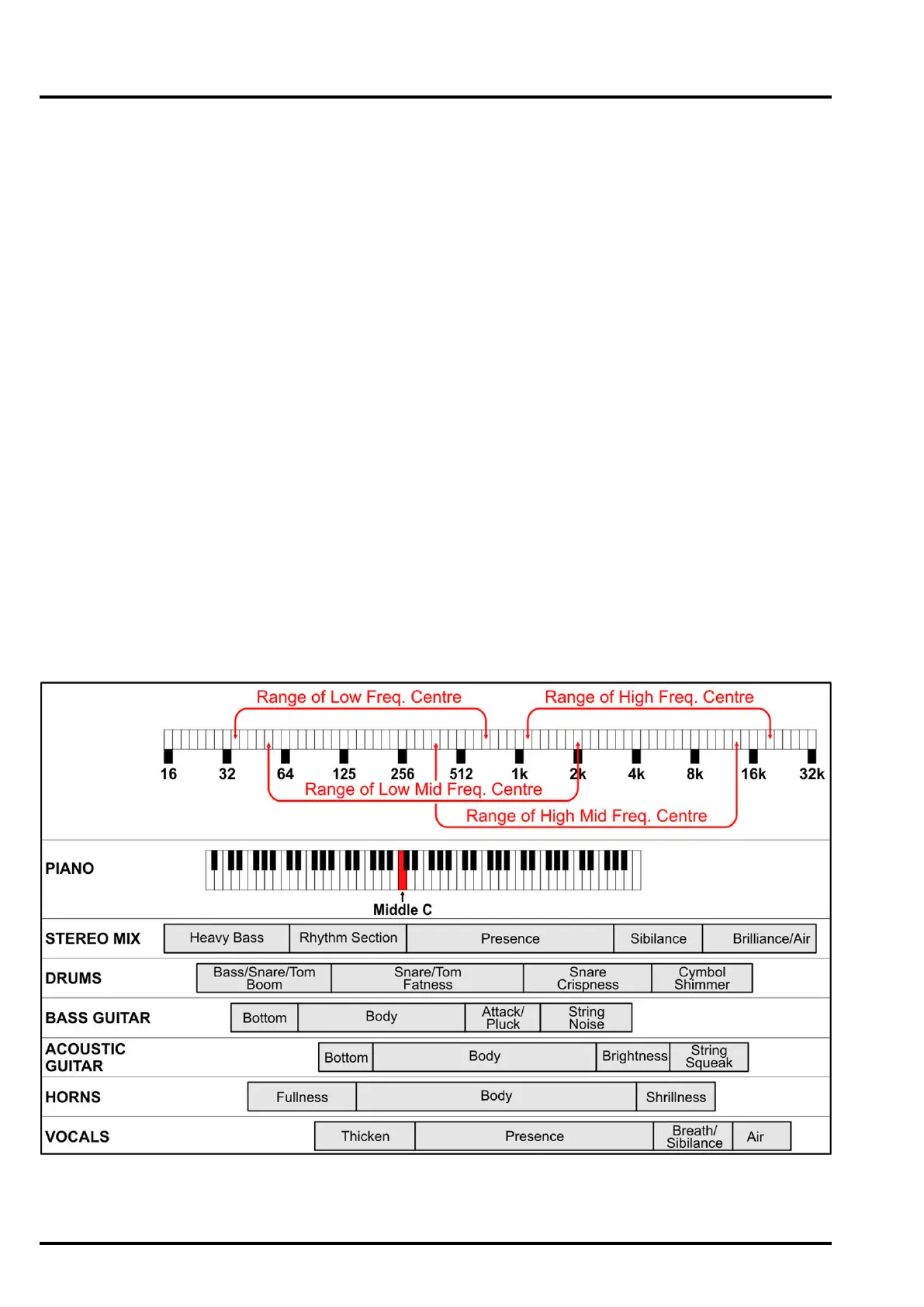 The following diagram provides a general idea of some useful frequencies that will aid in setting the eq. They are by no means