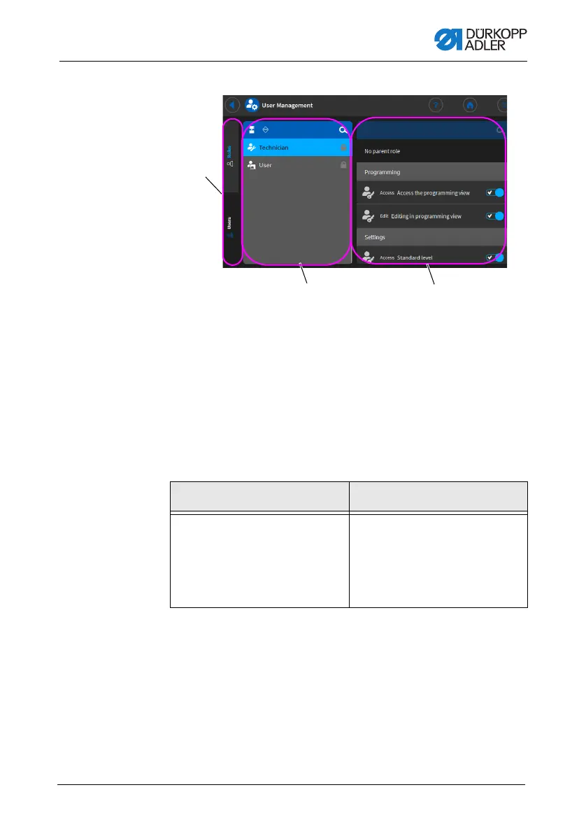the list (2) of created roles / users - varying with the tab (1) you