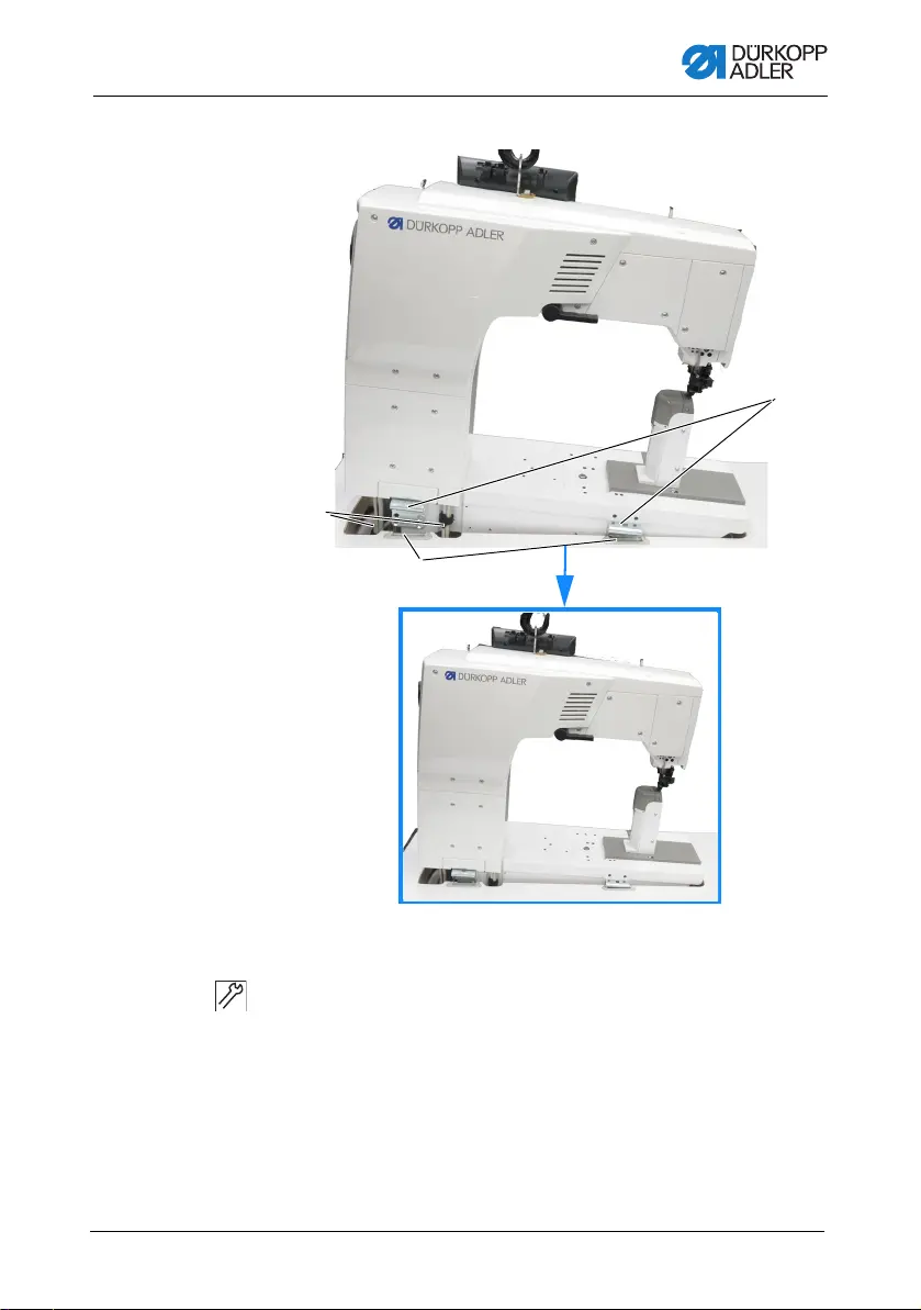 1. Tighten the upper hinge parts (2) onto the machine head.