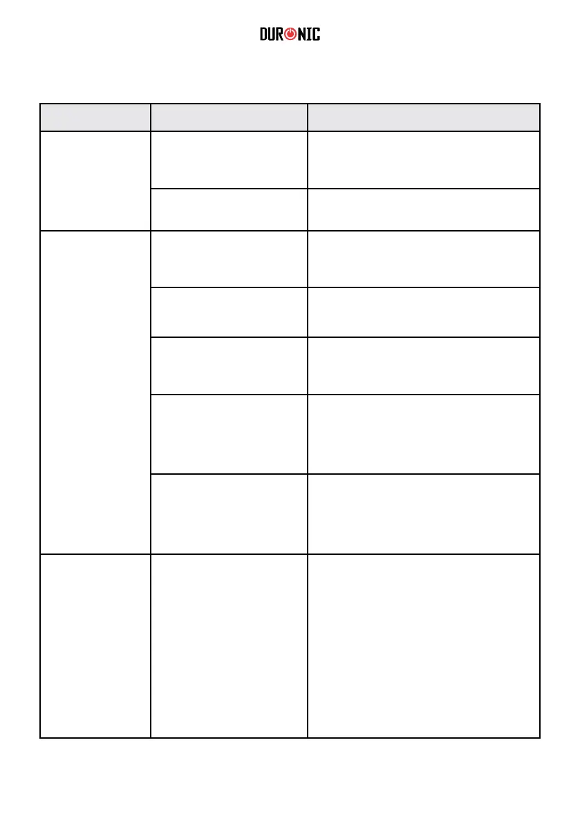 Diğer sorunlar veya sorularınız için lütfen Duronic ile iletişime geçin.