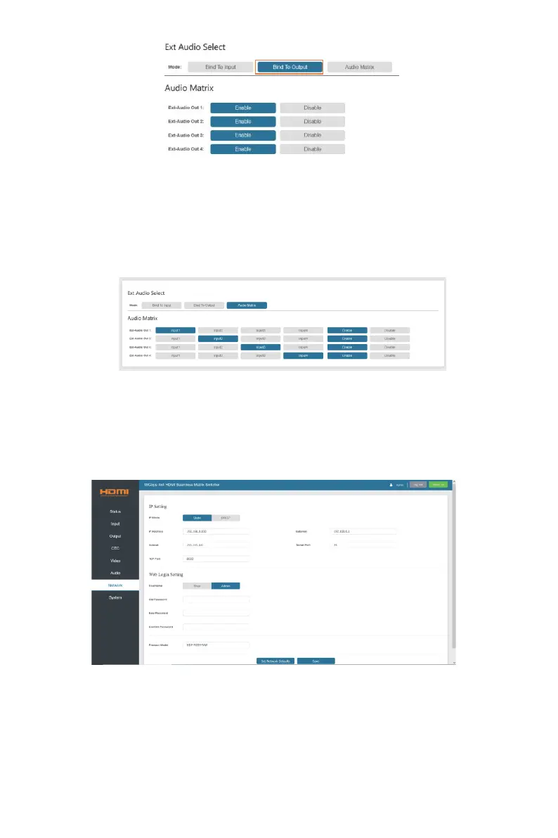 Audio Matrix: you can select the audio of any HDMI input source for the corresponding