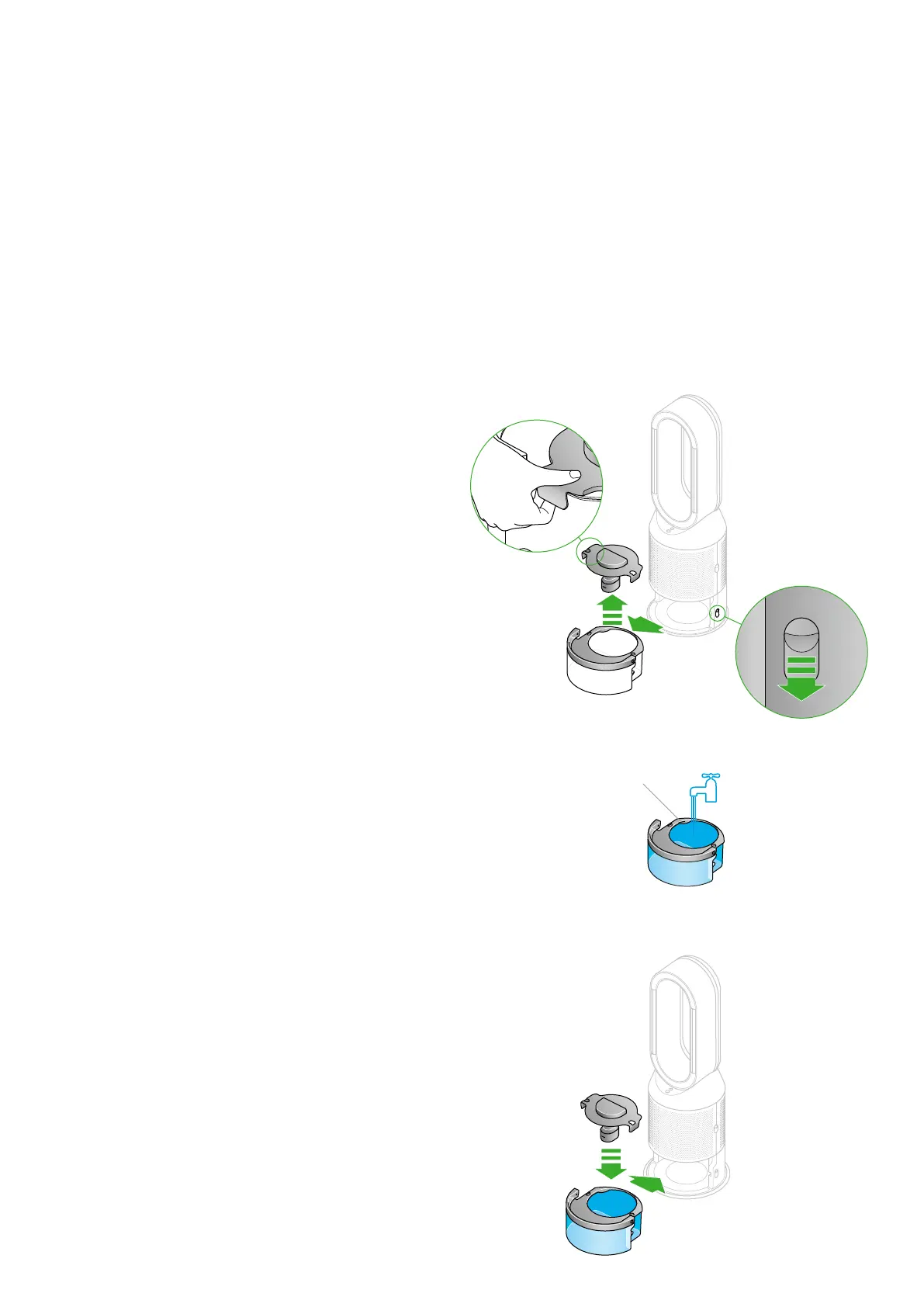 Carry the water tank by its handle to the tap, and unclip the cap.