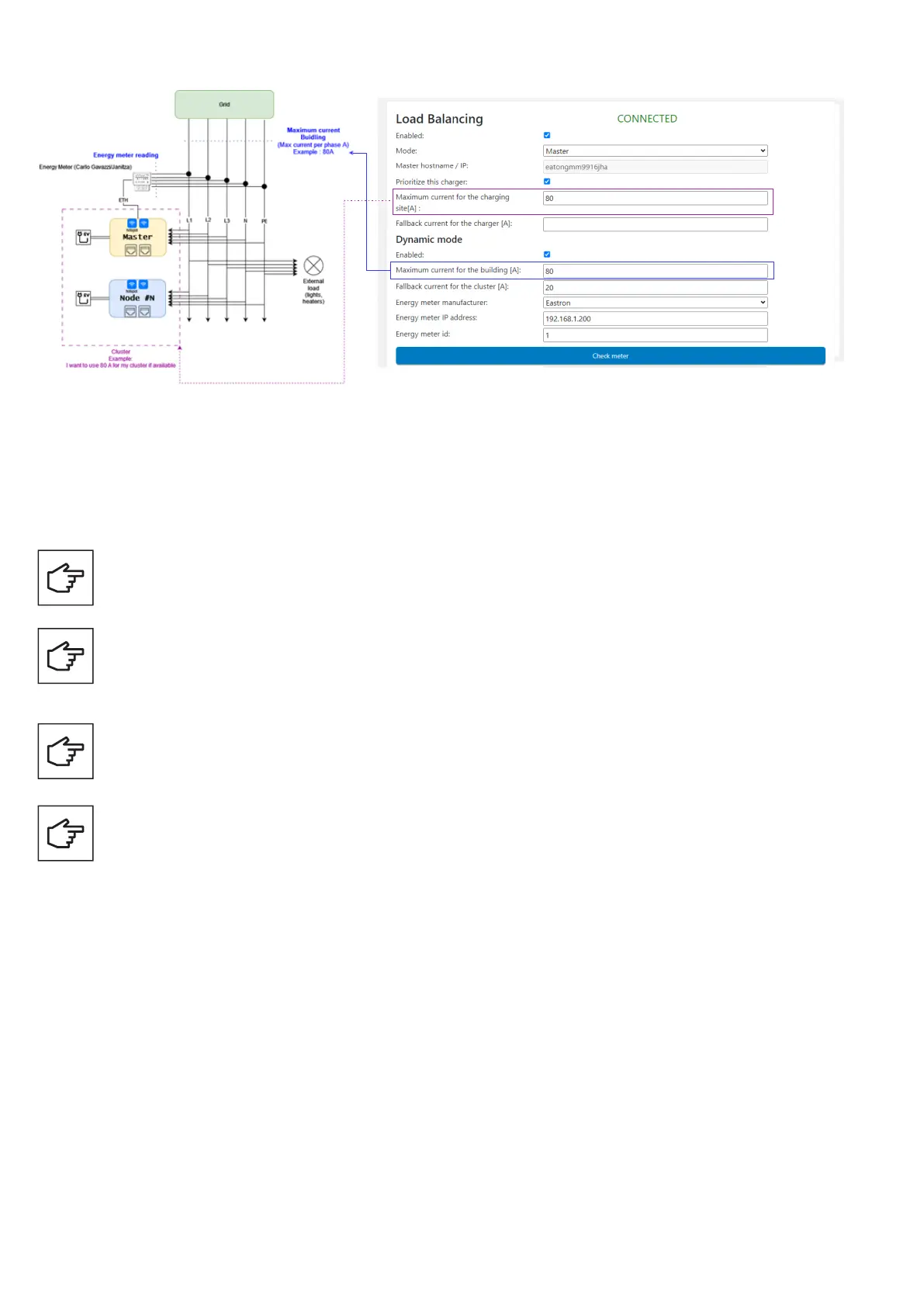 Master should be configured first, followed by the EV chargers configured as nodes. An energy meter should be connected to