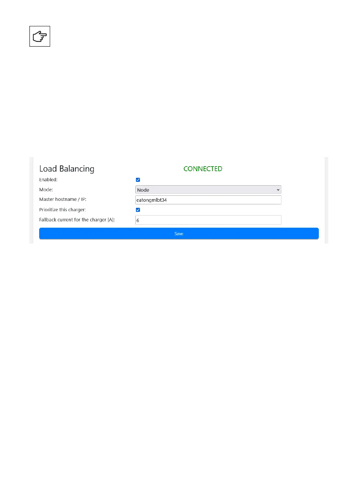 Step 4. Make sure the name of the EV charger configured as Master is visible in the Master hostname/IP text box. In case the