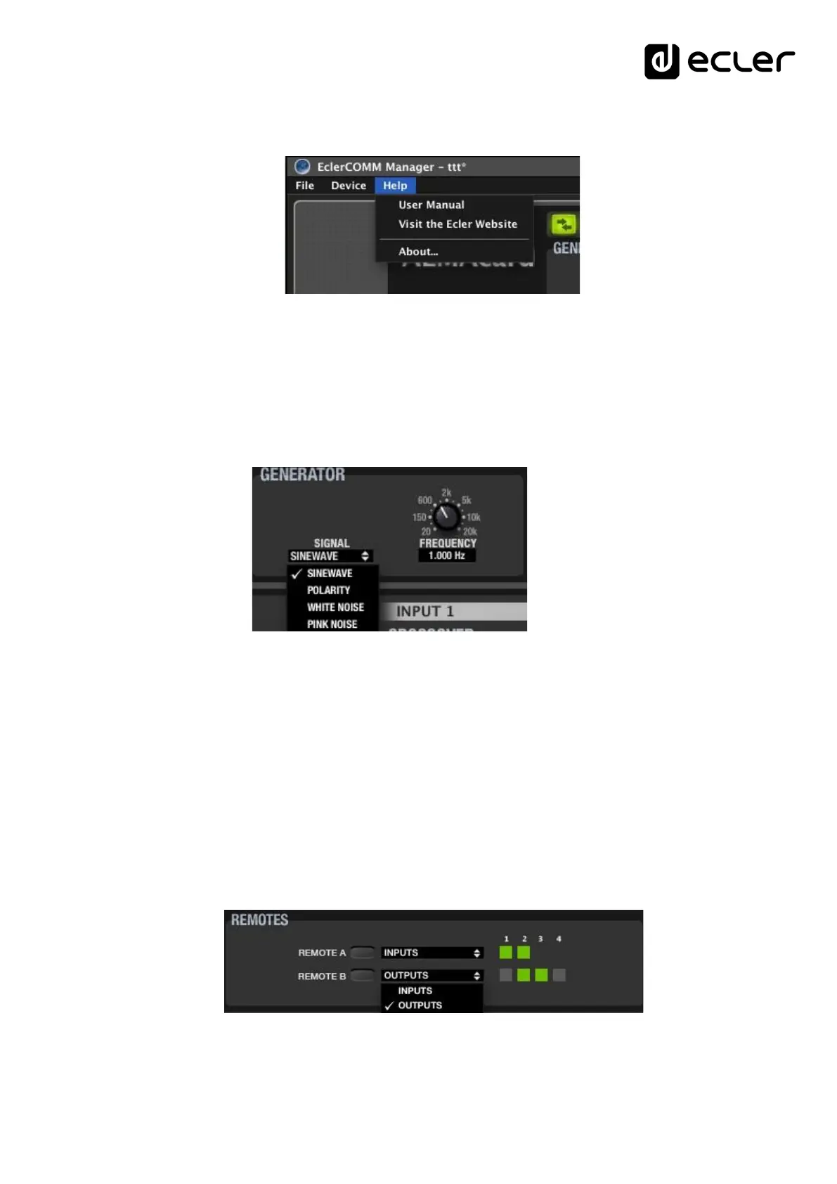 • Help : gives access to the user manual, to the Ecler website, and displays the