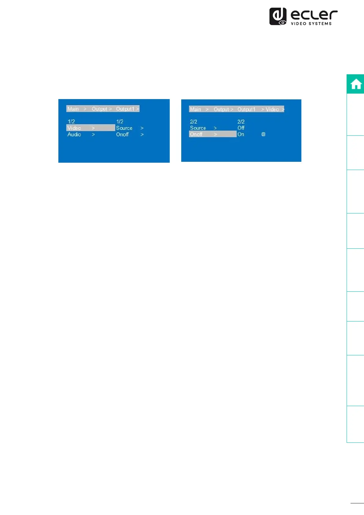 Video signal can be switched on and off on any output selected. By default, the output
