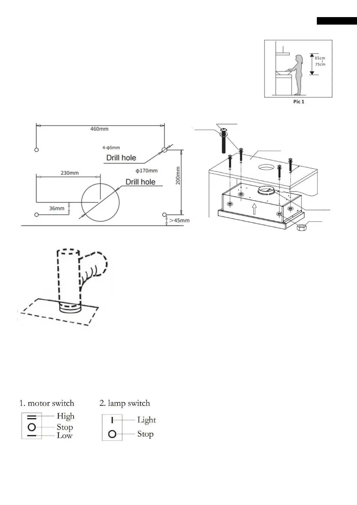 2. Bor fire hull på Ø5mm og ett hull på Ø170mm i bunnen av det hengende skapet (i henhold til figur