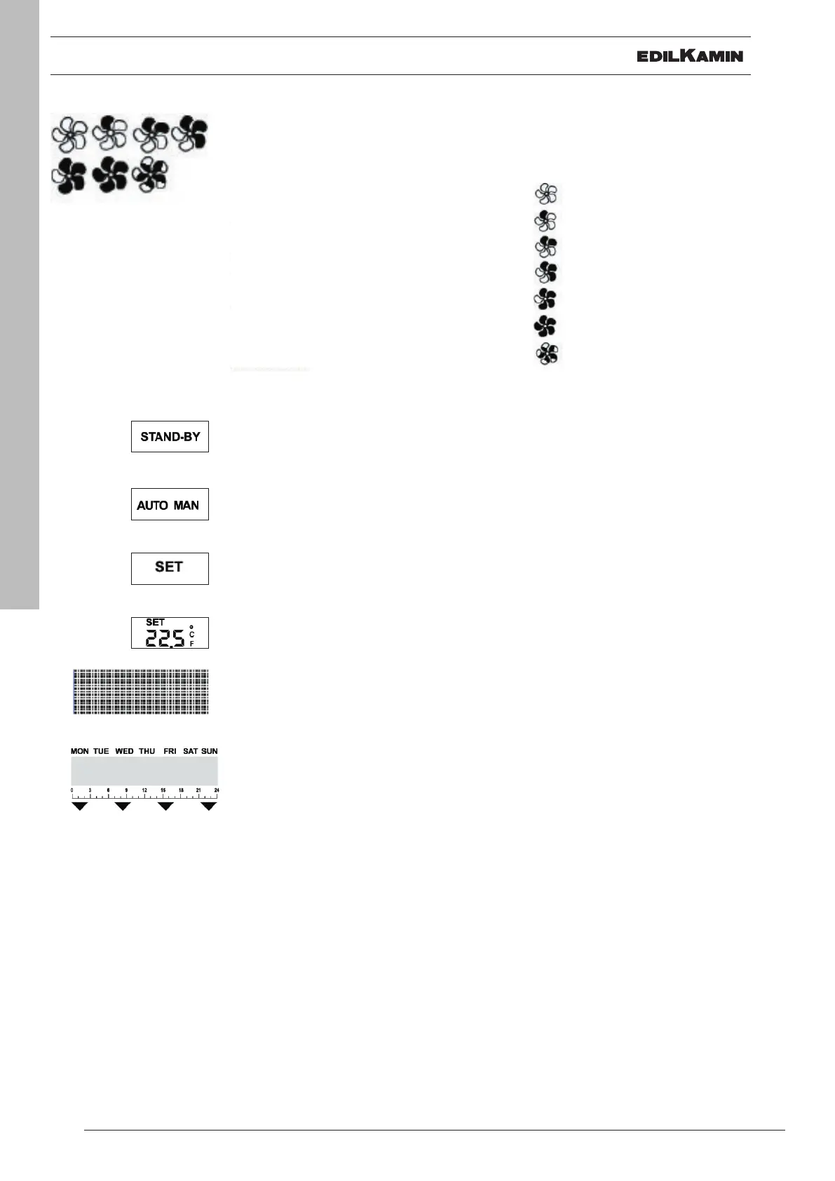 Tekens voor SET. Instelling van de verschillende grootheden bij SET: temperatuur, vermo-