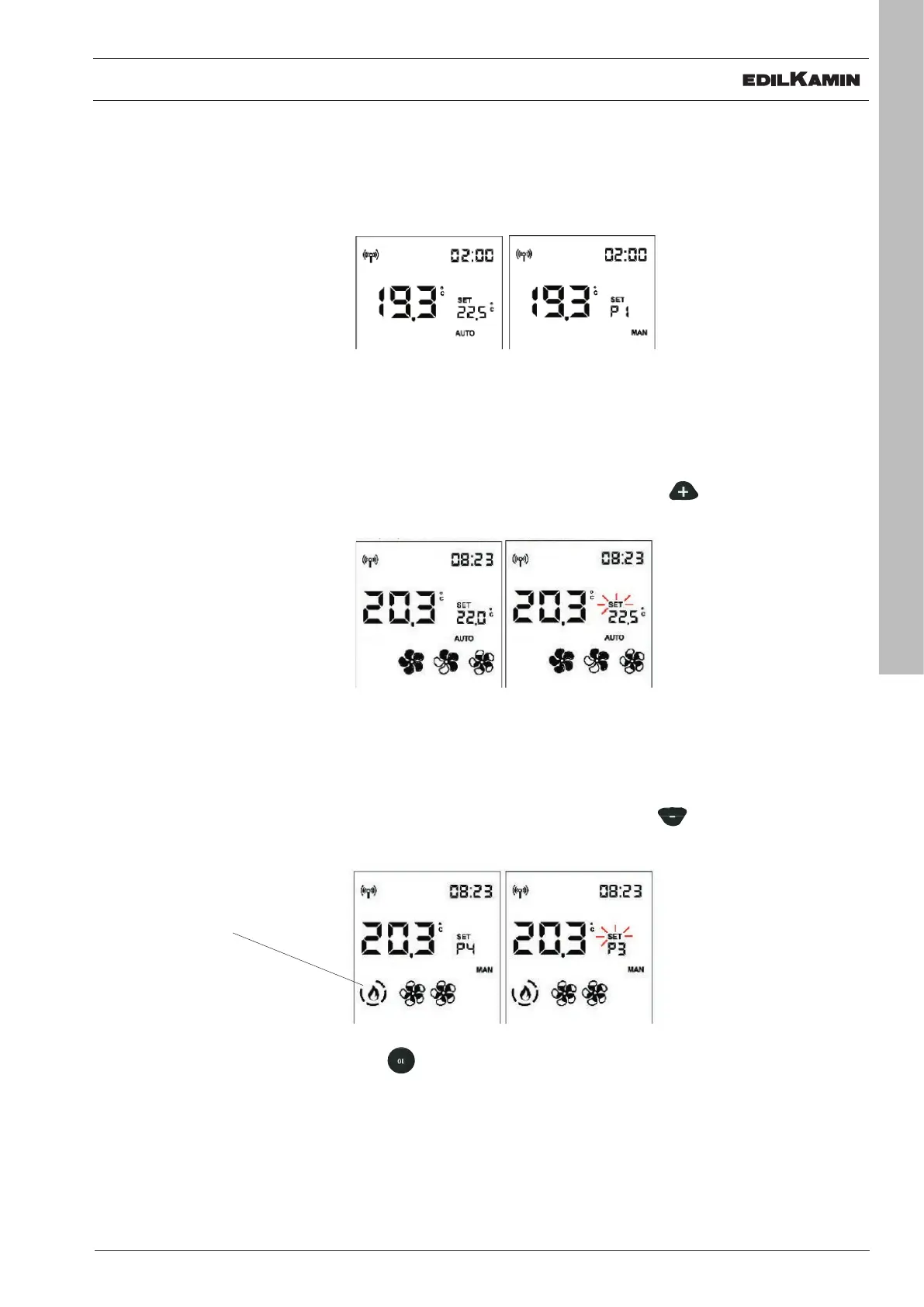 Wijzig het vermogensniveau (weergegeven door het vlamsymbool) met de toetsen “+” en “-“.