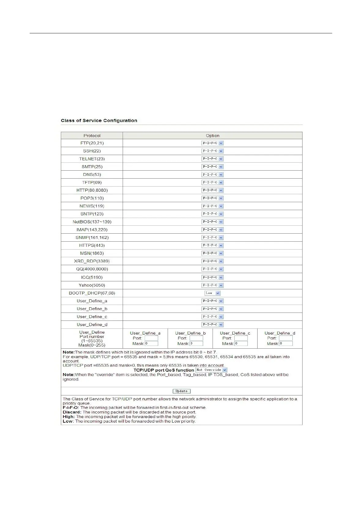 Choose QoS Setting > TCP/UDP Port Based and the following page appears. COS based on TCP/UDP port specifies