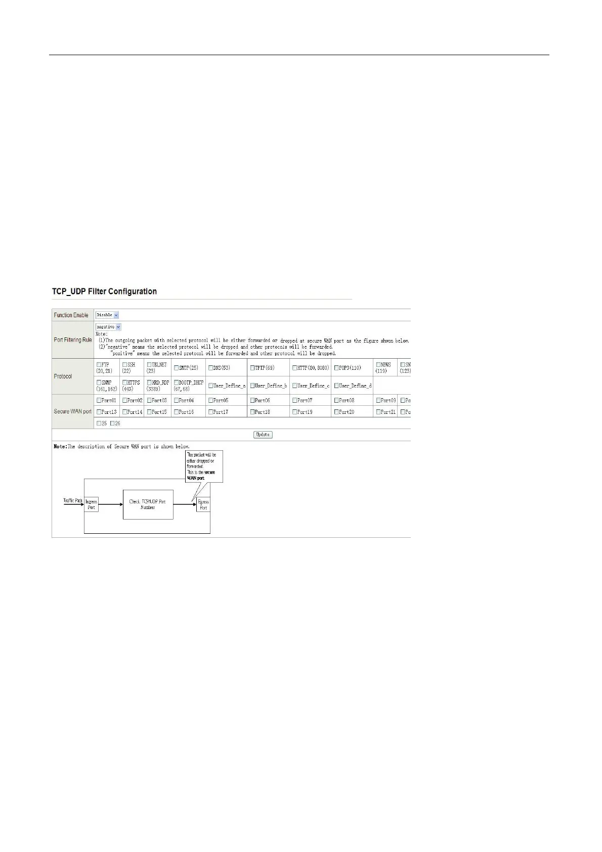 Choose Security > TCP/UDP Filter and the following page appears. TCP/UDP port filter discards the set protocol