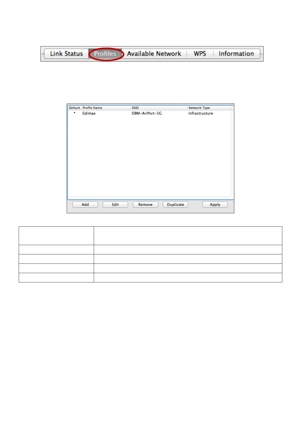 Karta “Profiles” umožňuje uložit různá nastavení bezdrátového připojení jako