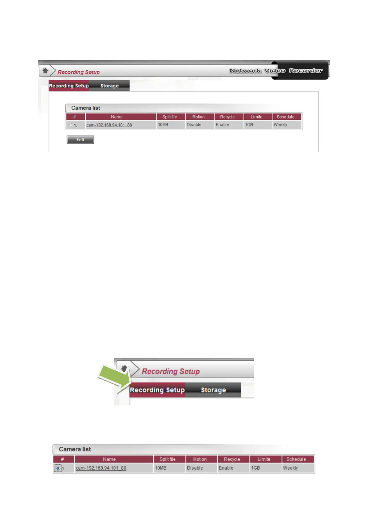 To setup recording, select an IP camera from ‘Camera list’ by clicking its number (under ‘#’