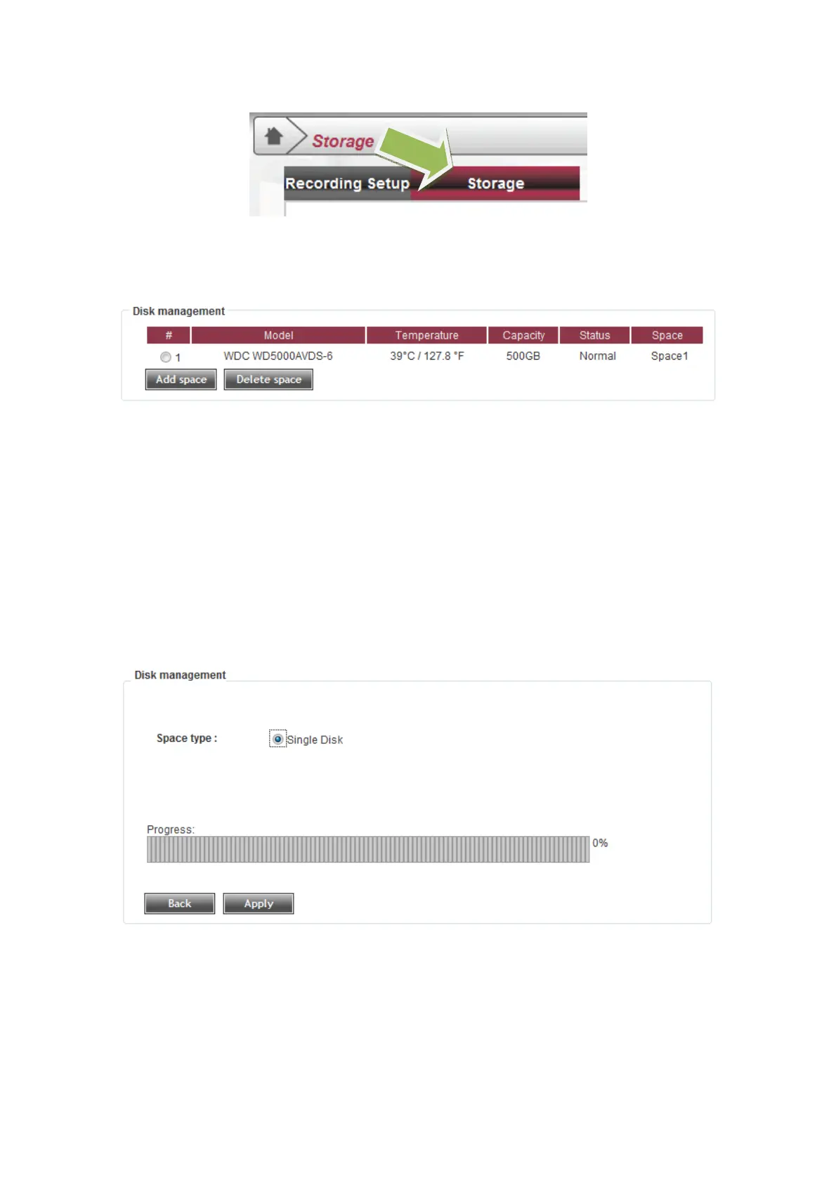 All hard drives will be listed here. If a disk is not configured for video recording, the ‘Space’