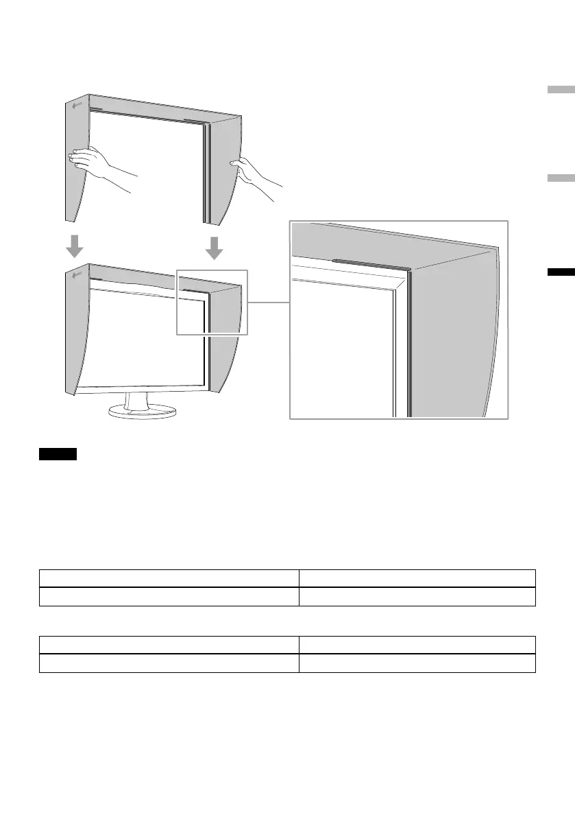 この製品は、横表示時専用のフードです。モニターを縦表示にして使用する場合には取り付けられません。