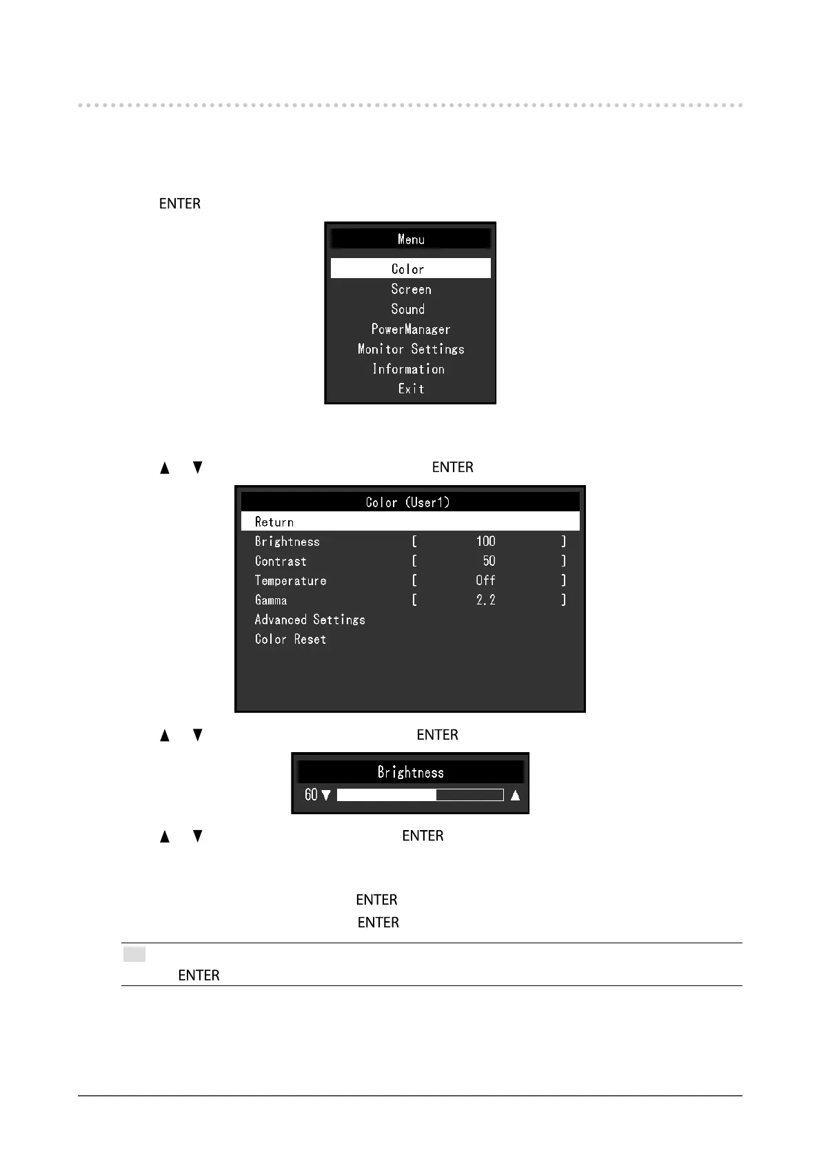 1. 用 和 选择要调节 / 设 置 的 菜 单 ,然 后 按 。显 示 子 菜 单 。