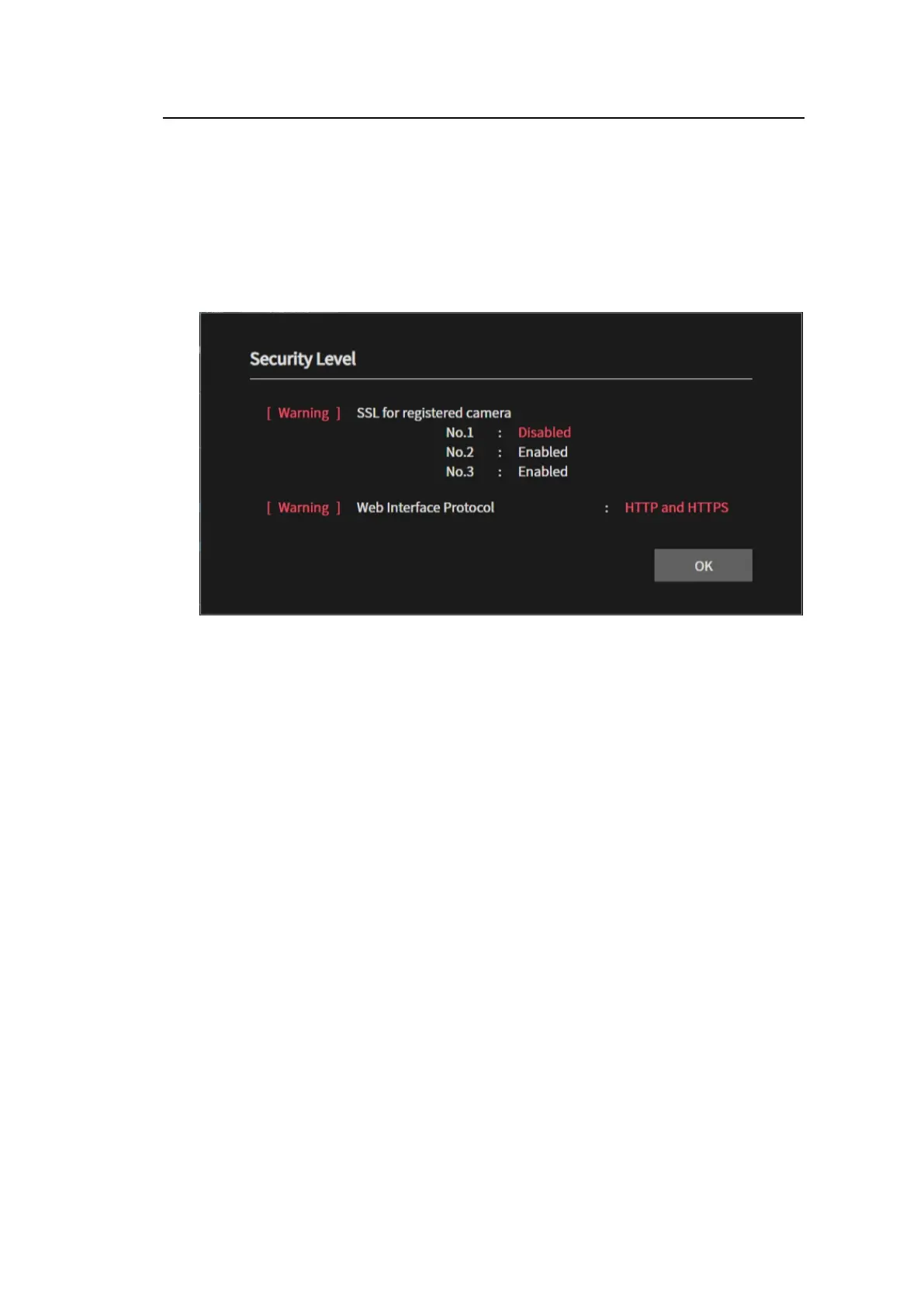 If "Web Interface" > "Protocol" is set to "HTTPS," "OK" is displayed. If it is set to anything