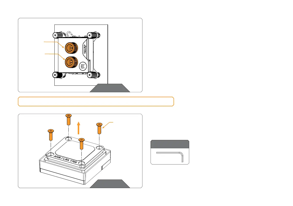 Screw in two (2) G1/4 threaded male fittings. Attach the liquid