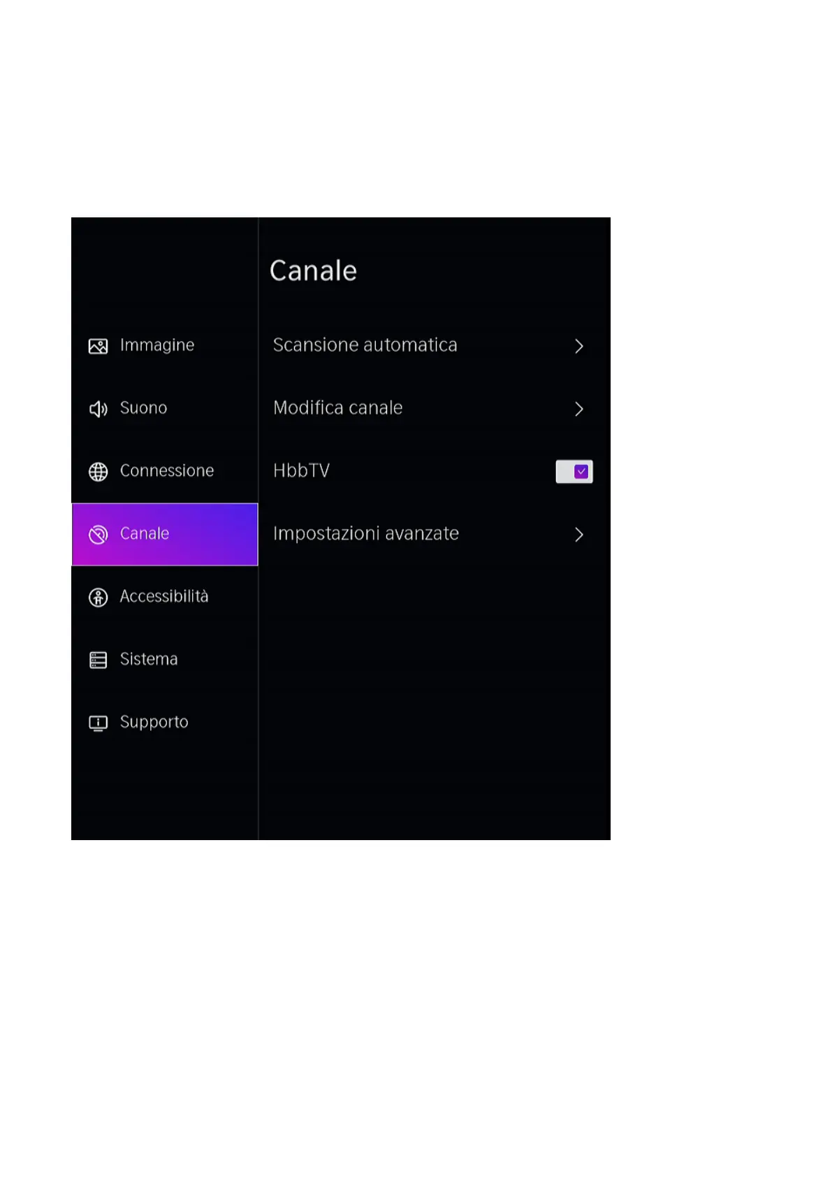 Per accedere al menu CANALE, selezionare l’icona IMPOSTAZIONE (n. 6 a pagina 30) dalla