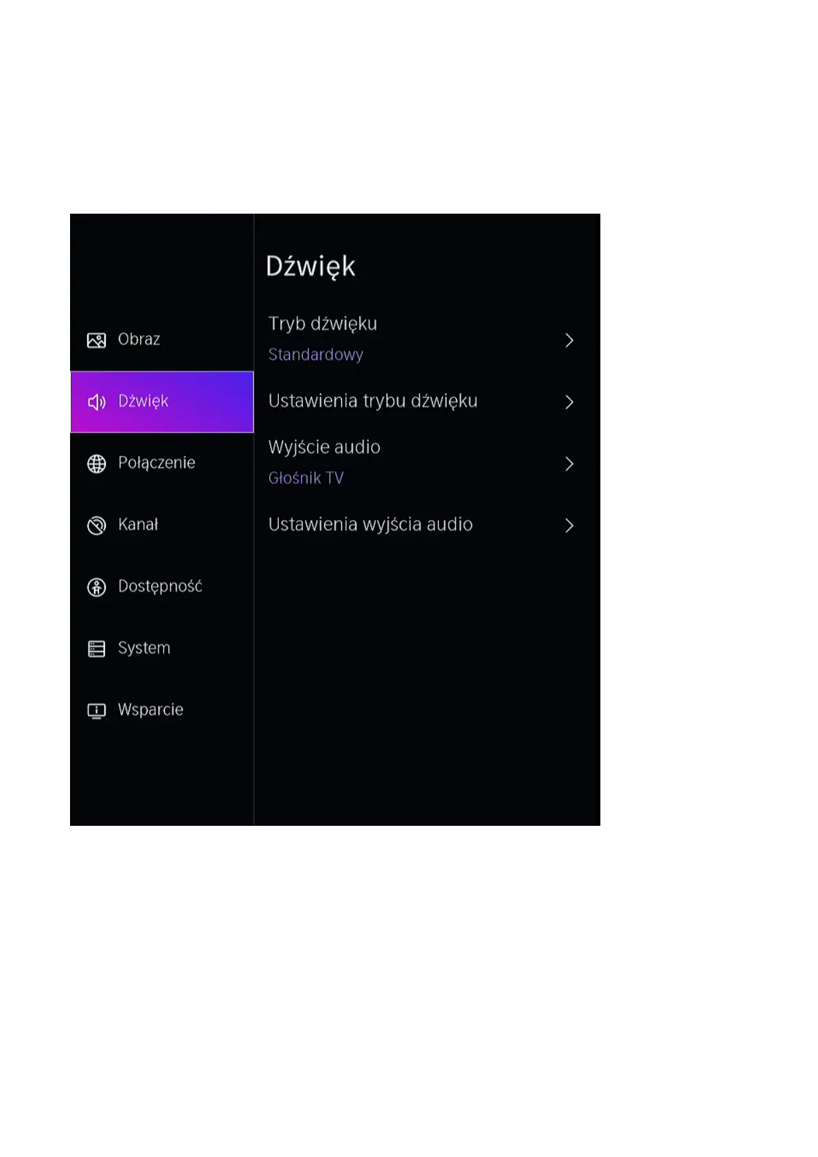 Aby uzyskać dostęp do menu Dźwięk, wybierz Ustawienie (#6 na stronie 30), przejdź w dół i