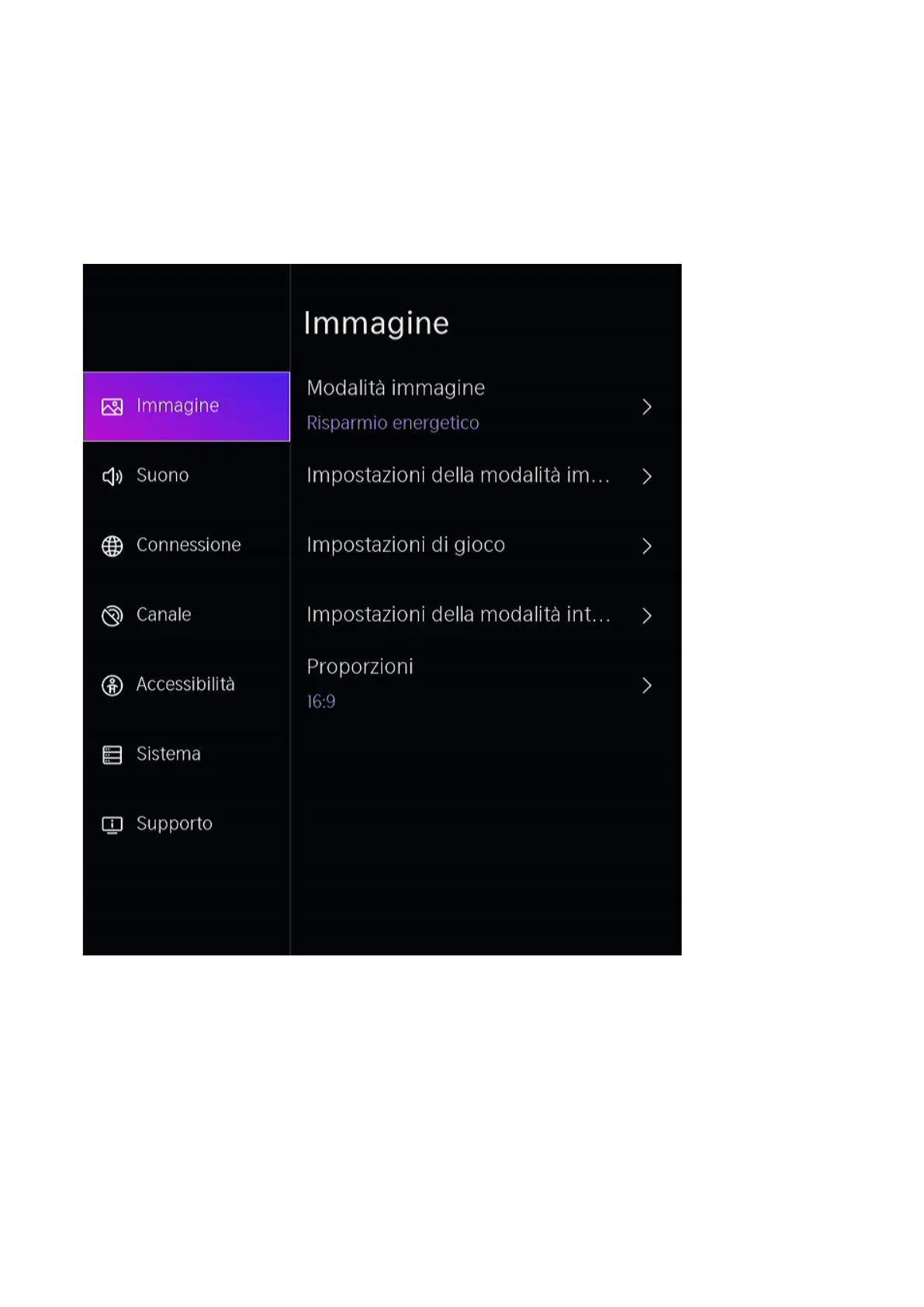 Per accedere al menu IMMAGINE, selezionare l’icona IMPOSTAZIONE (n. 6 a pagina 30) dalla