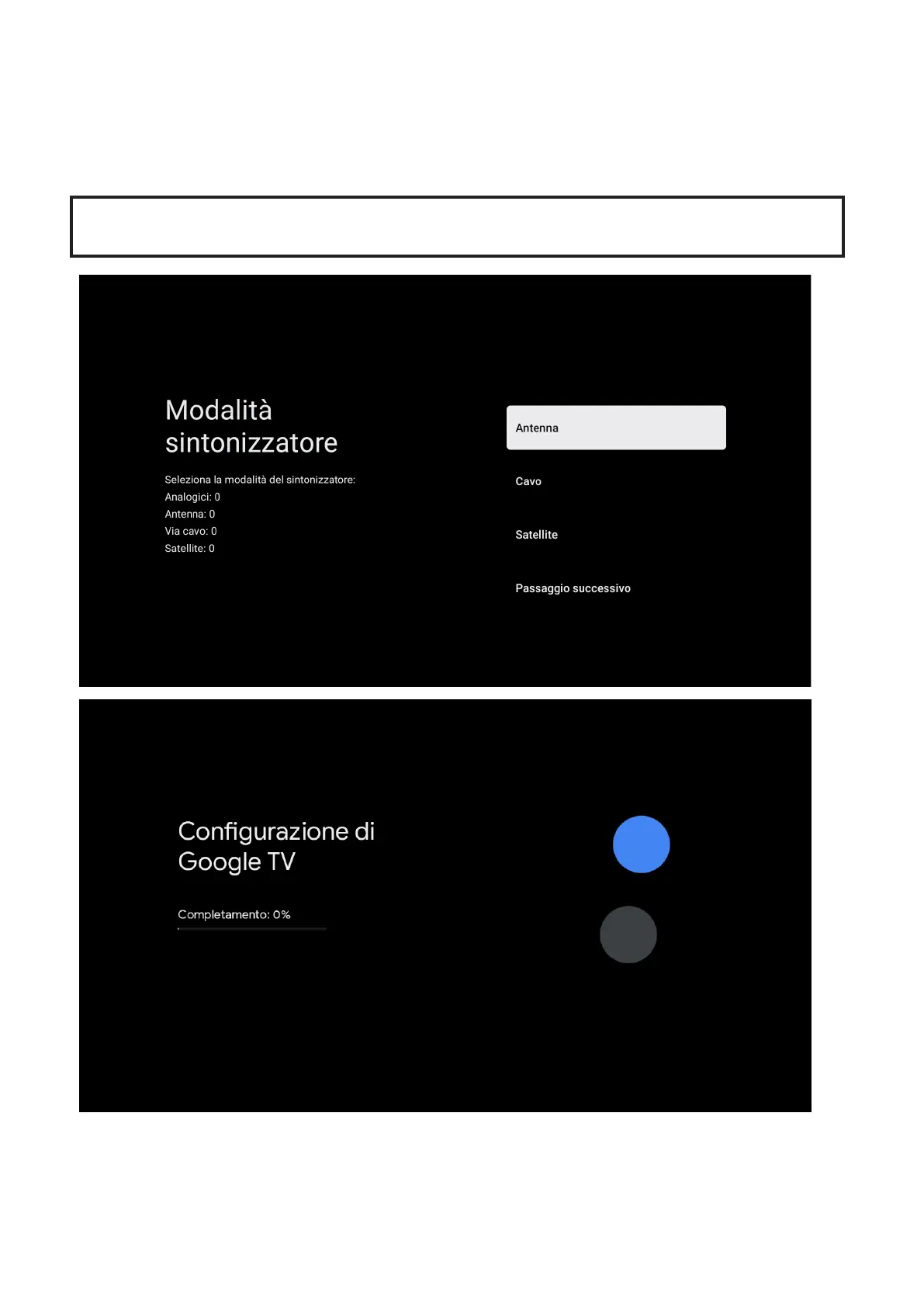 Assicurarsi di selezionare ā€œANTENNAā€ per eseguire la scansione dei canali utilizzando il cavo