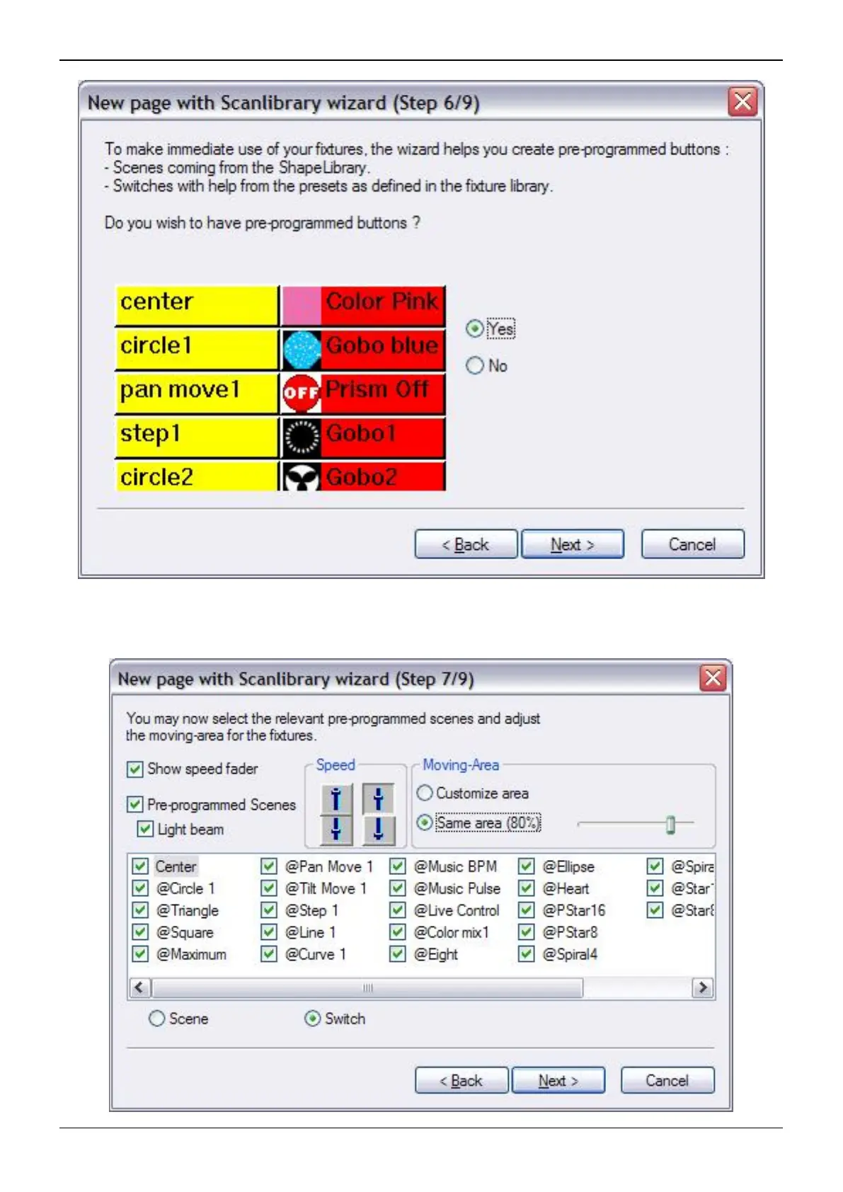 The next screen asks which preprogrammed movements you want to include (for moving heads