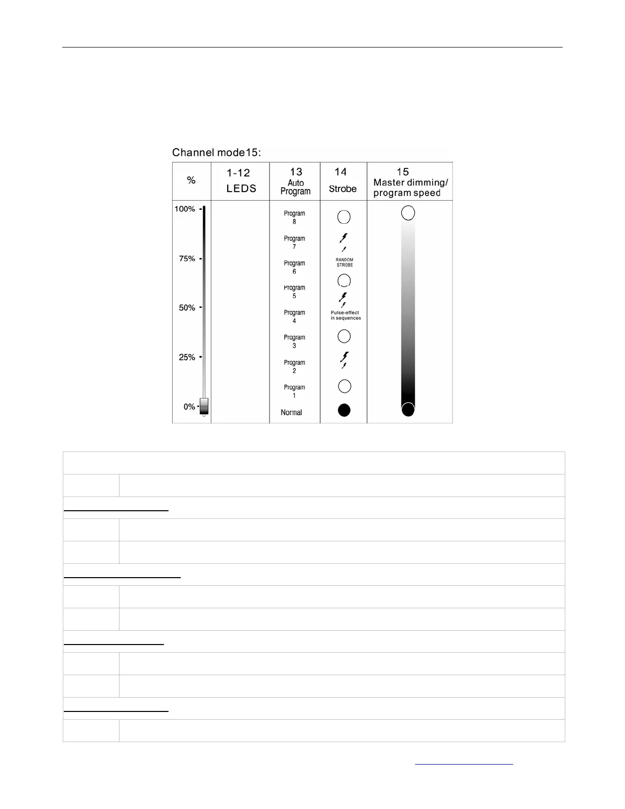15 Channel Mode: This chart details a simple layout of the DMX channel assignment in