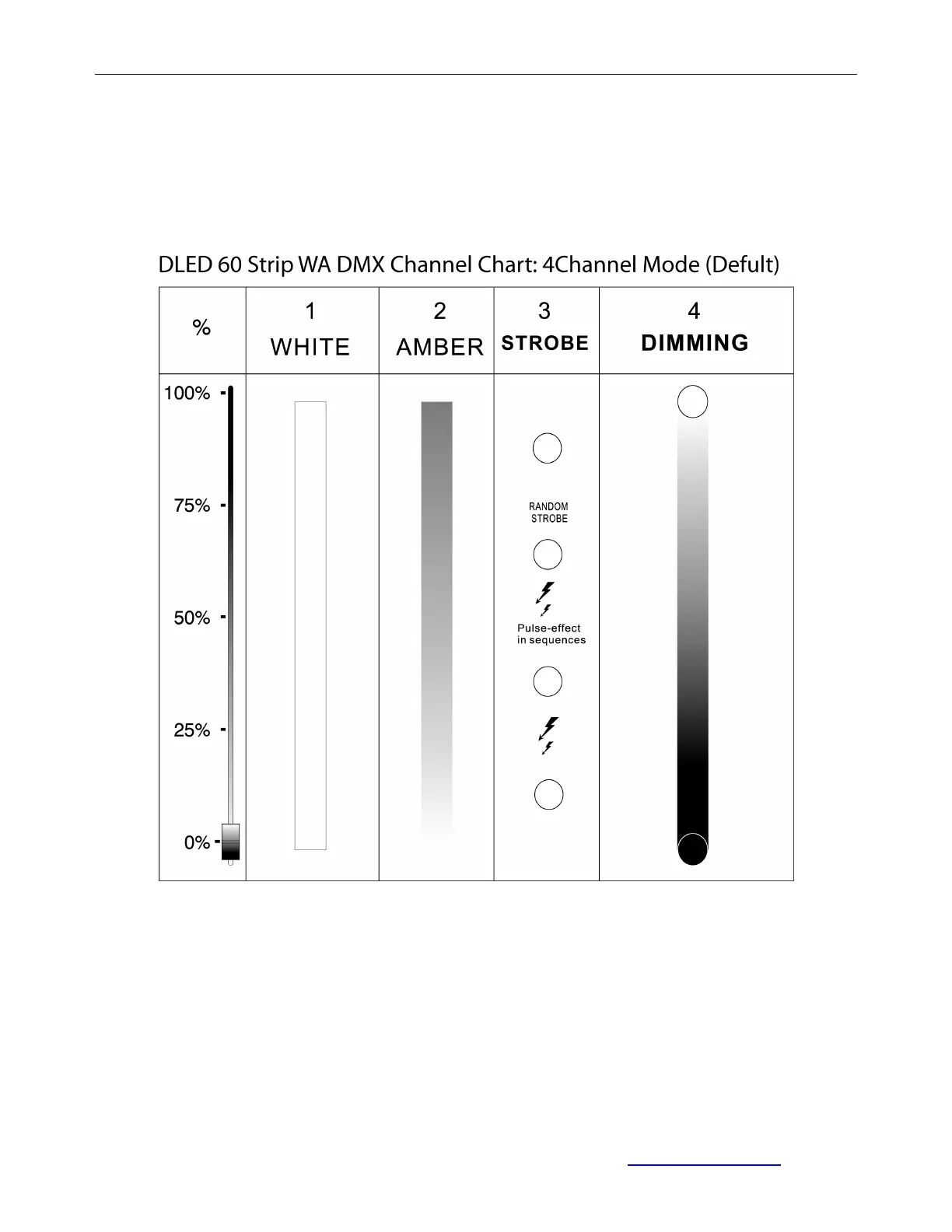4 Channel Mode (default): This chart details a simple layout of the DMX channel